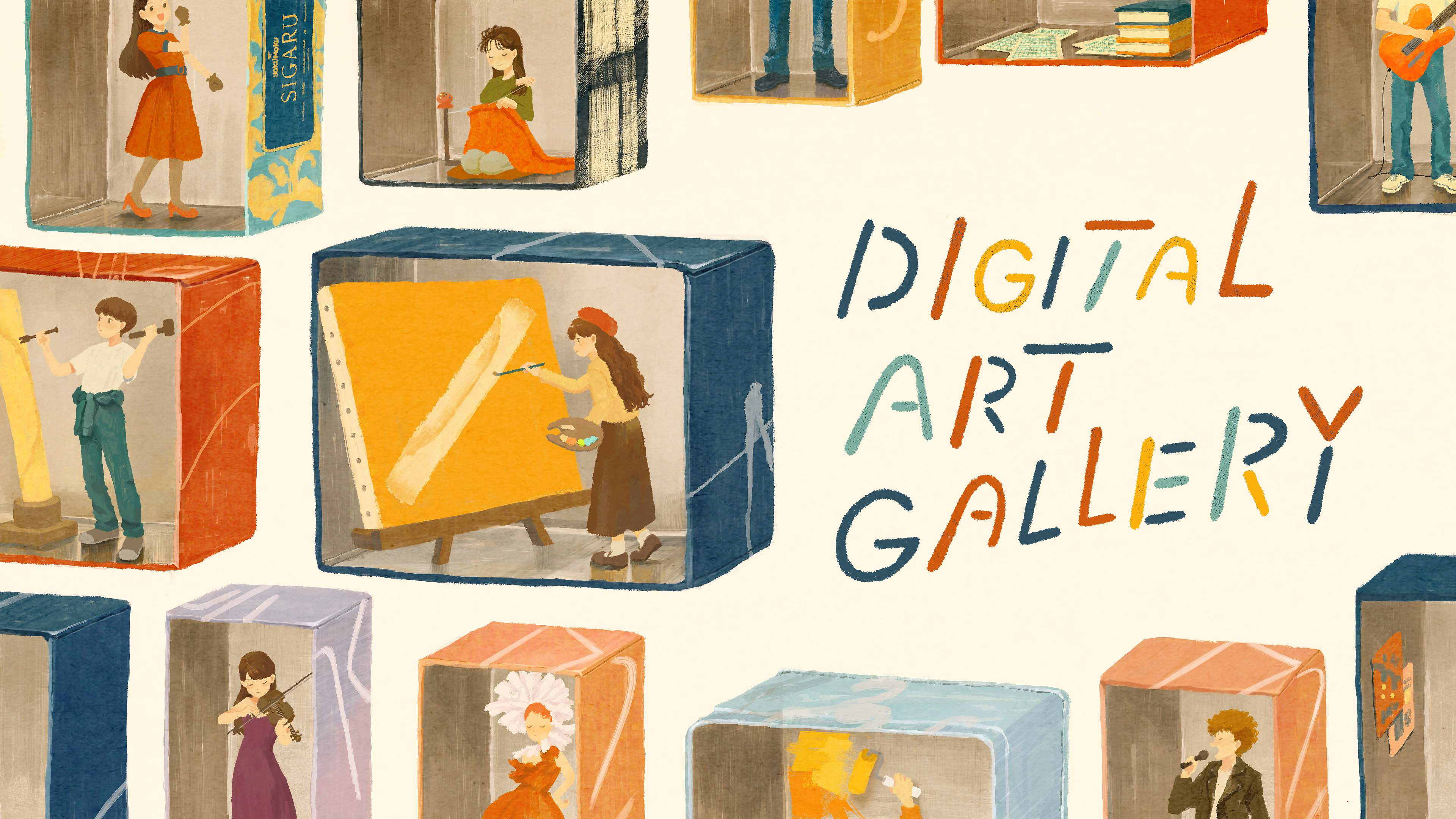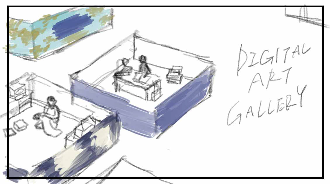 お菓子=作品としてギャラリーに展示しているイメージでギャラリーに訪れた人々がそれを受け取っている、鑑賞しているというイメージのイラスト案です。
