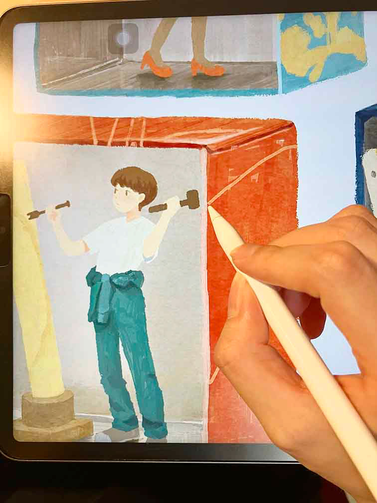 缶を描く時は、ヨックモックの実物の缶を見ながら描きました。缶の角のところのディティールが独特だったので実物を見て描くことで解像度が上がったと思います。デッサン人形もあるととても便利です。